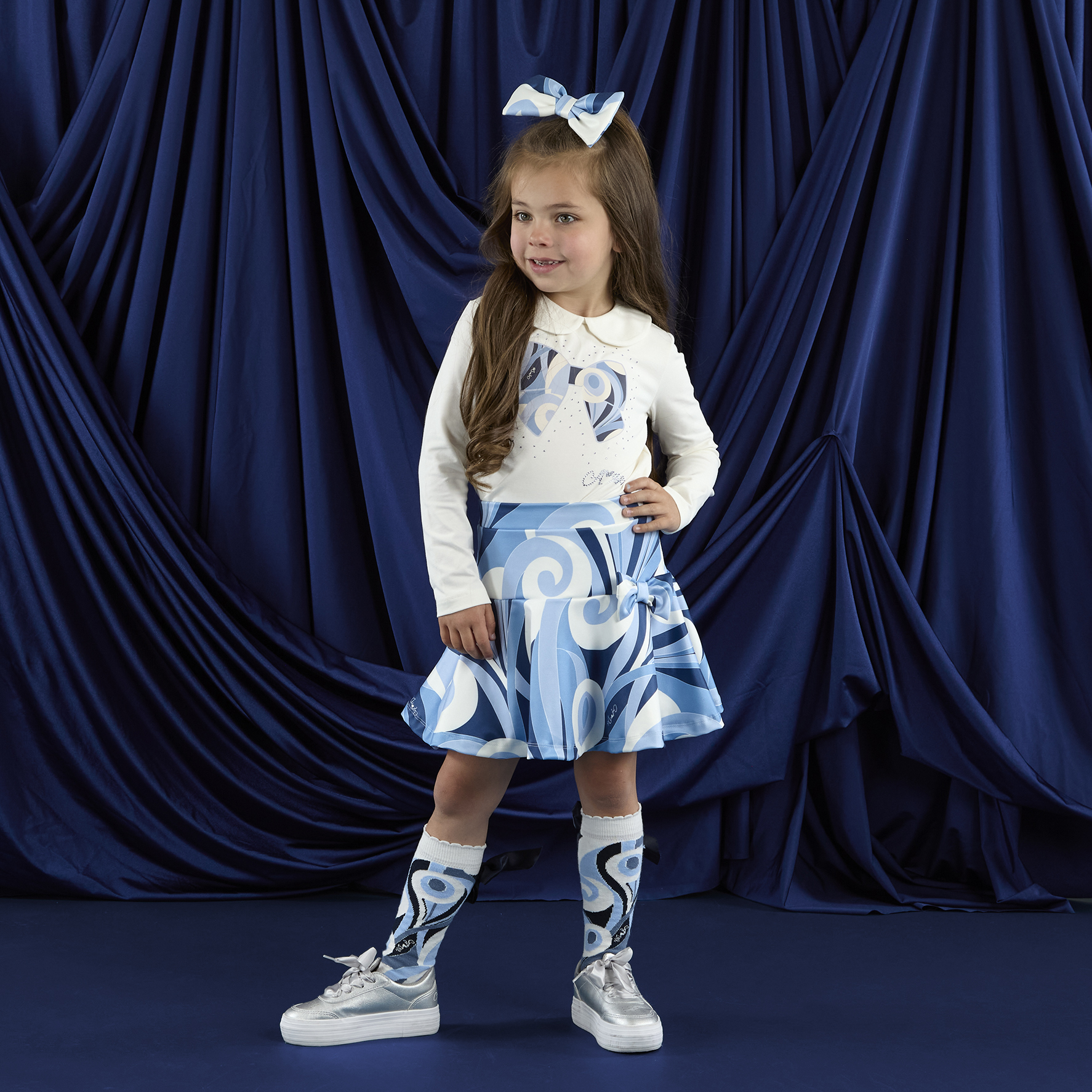 | The Nellie set comes with a Twilight Twirls printed skirt featuring a cute bow applique at the waist. Paired with a long sleeve top with a pretty bow artwork and sweet collar! This set is just what an A*Dee girl needs this season! |