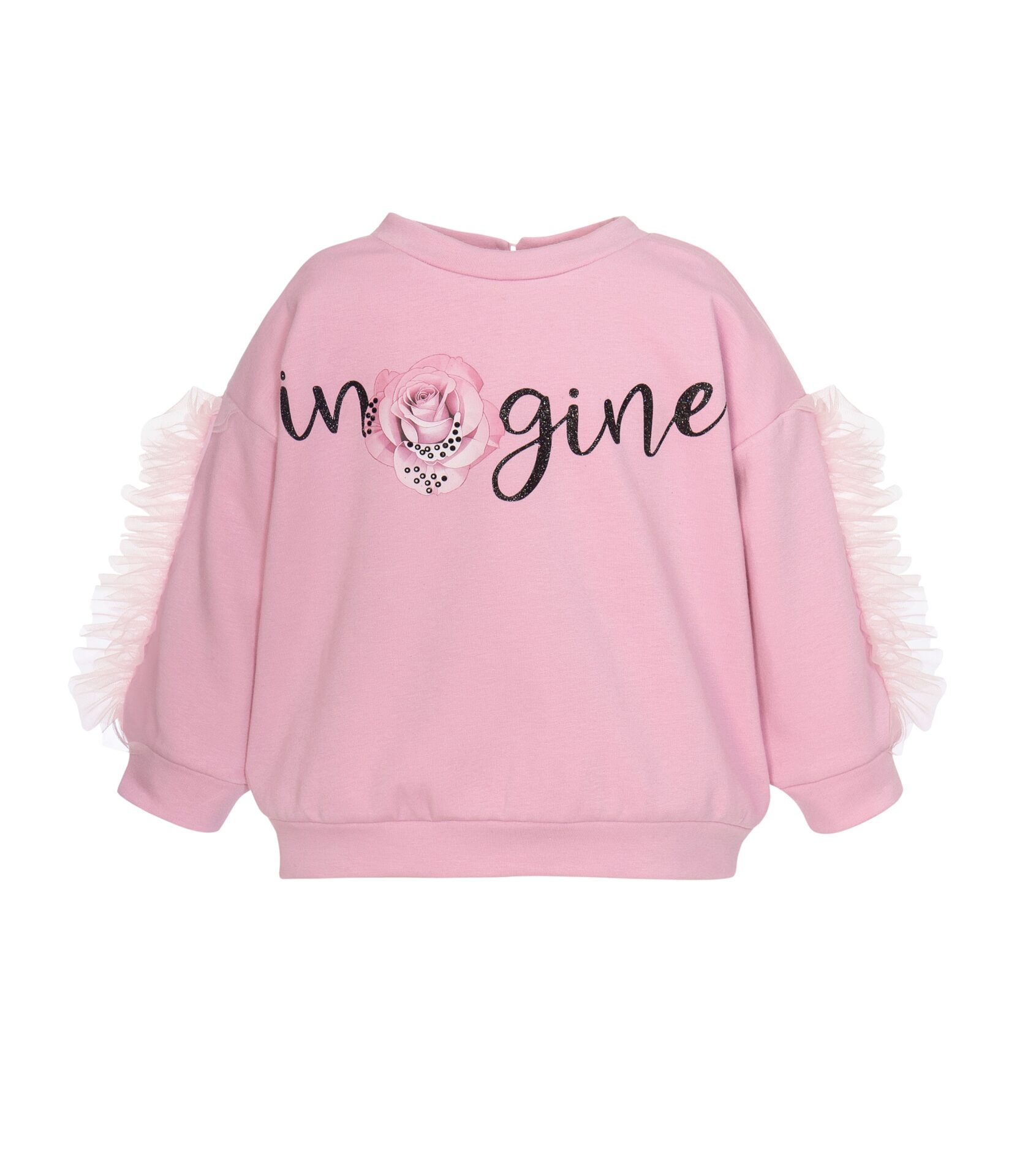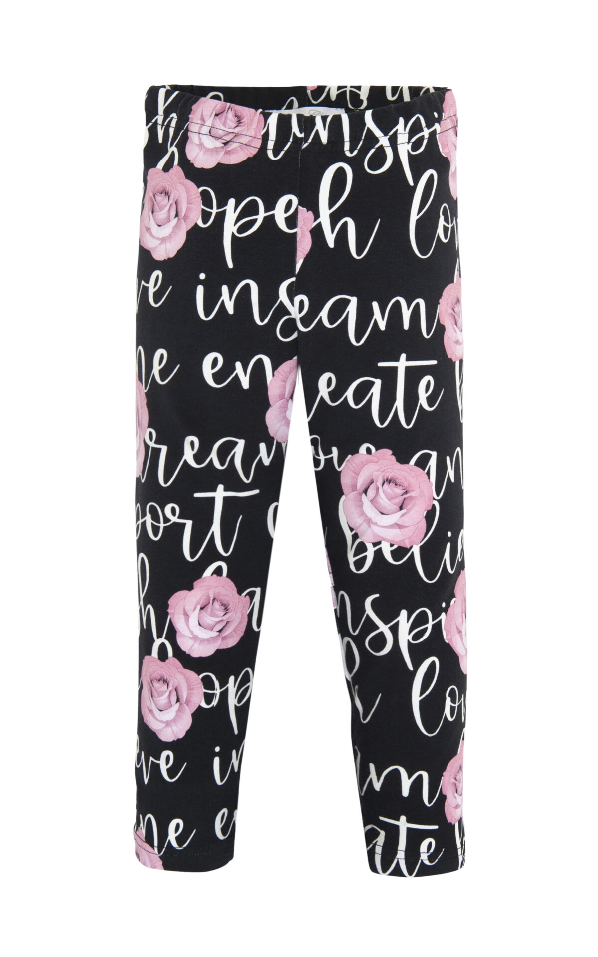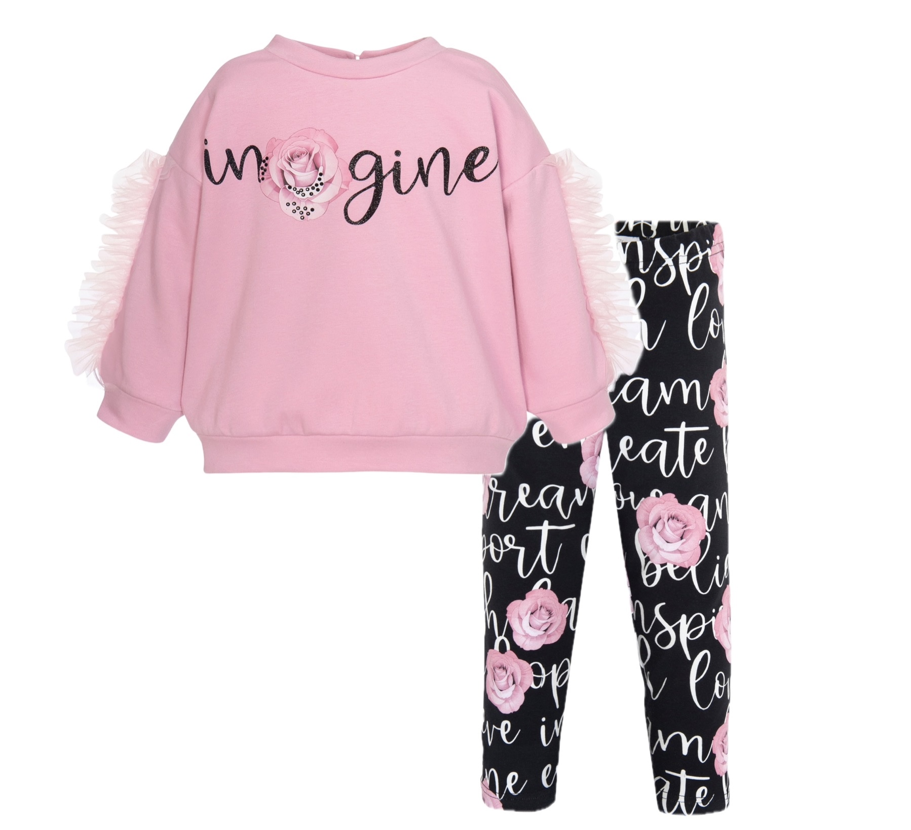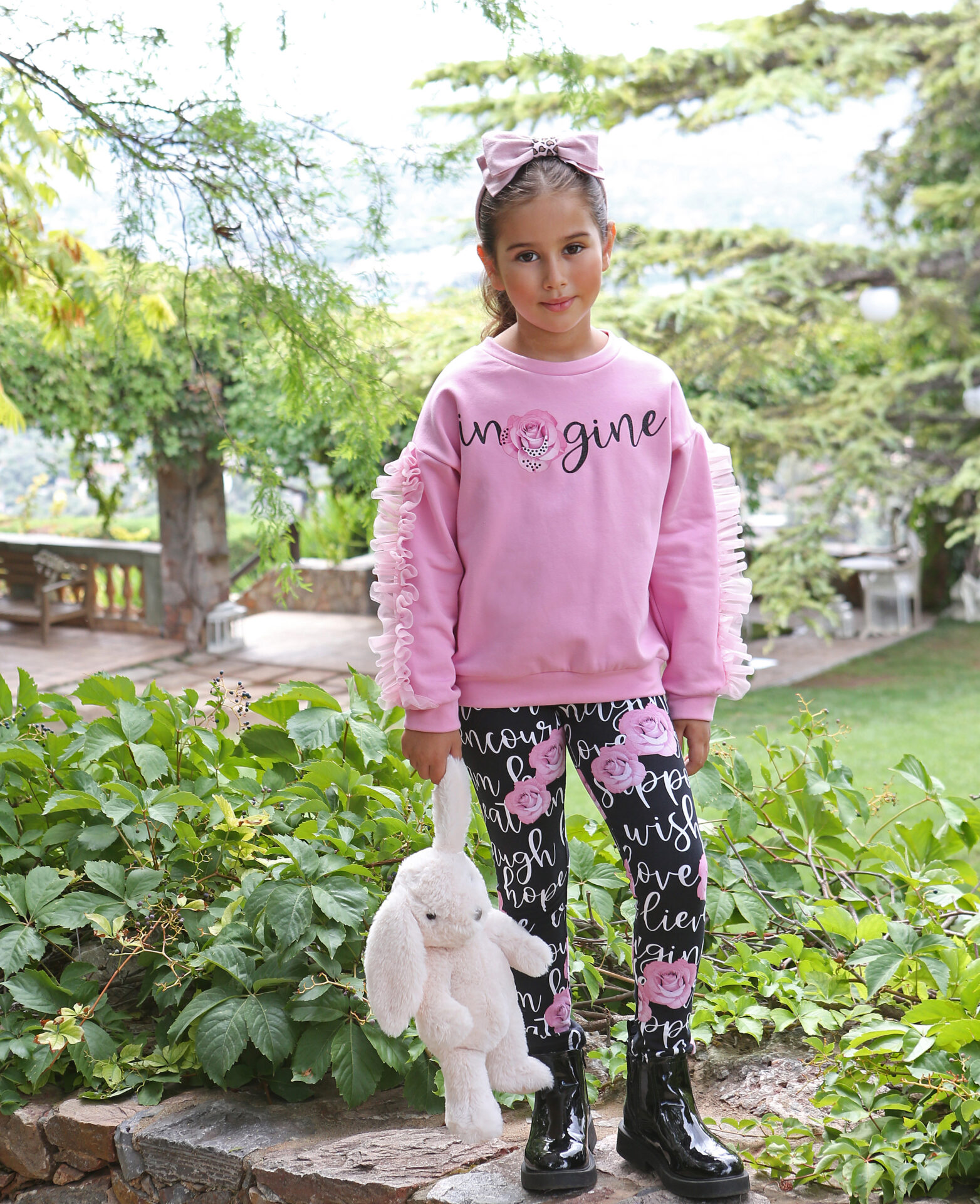 Beautiful pink jumper light fleece lined with ruffle sleeve soft perfect for winter! Black leggings with rose detail pattern