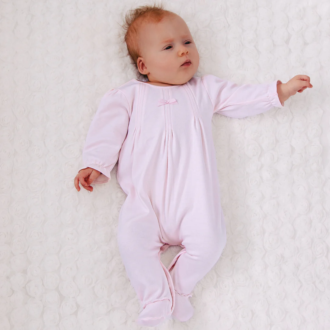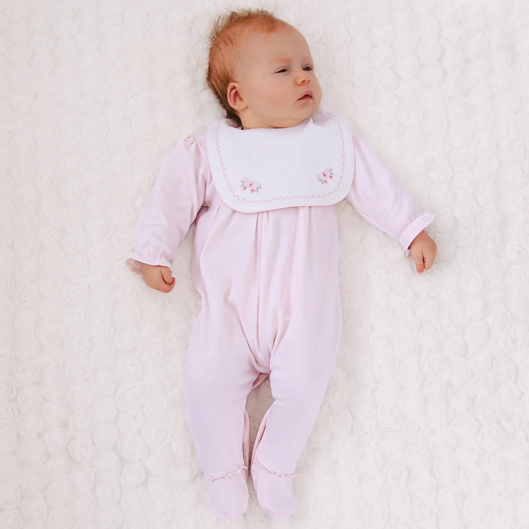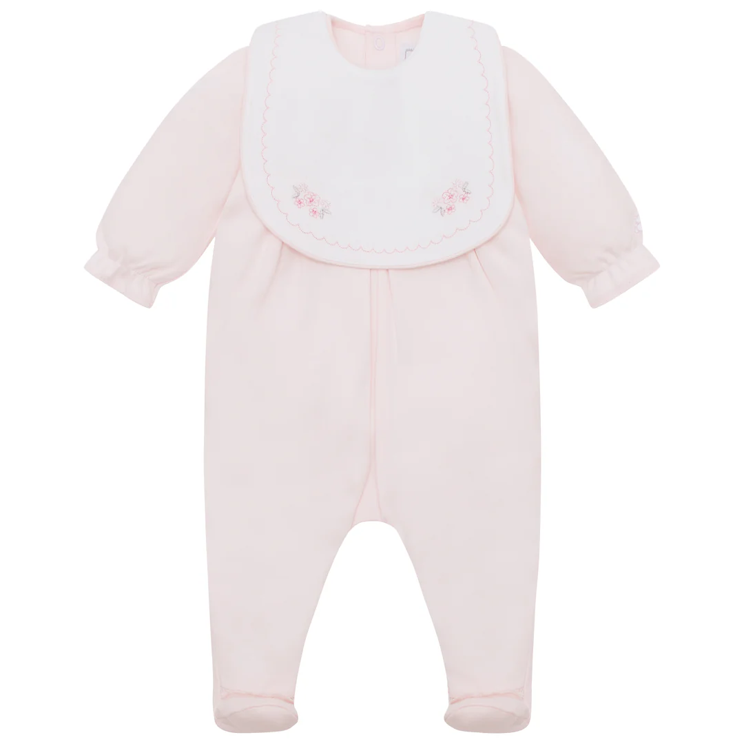 This lovely baby girls’ babygrow represents traditional, yet practical, baby clothing at its best. A beautifully embroidered detachable bib with pretty floral embroidery takes centre stage. Popper attachments mean easy removal and underneath, the yoke of the babygrow has a pleating and a central delicate satin bow. Relaxed in fit making it super comfy for baby, Lisa is the perfect new baby gift.